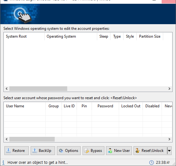 PE 시스템에서 소프트웨어를 실행하고, 작업할 사용자를 선택한 다음, "바이패스" 또는 "재설정/잠금 해제"를 선택하고 화면의 지시에 따라 진행하십시오. 작업이 완료되면 시스템을 재시작하고 시스템에 접속할 때까지 기다리십시오.