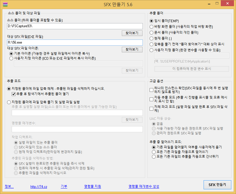 - Self destructing mode (delete SFX file after executable file has finished executing)